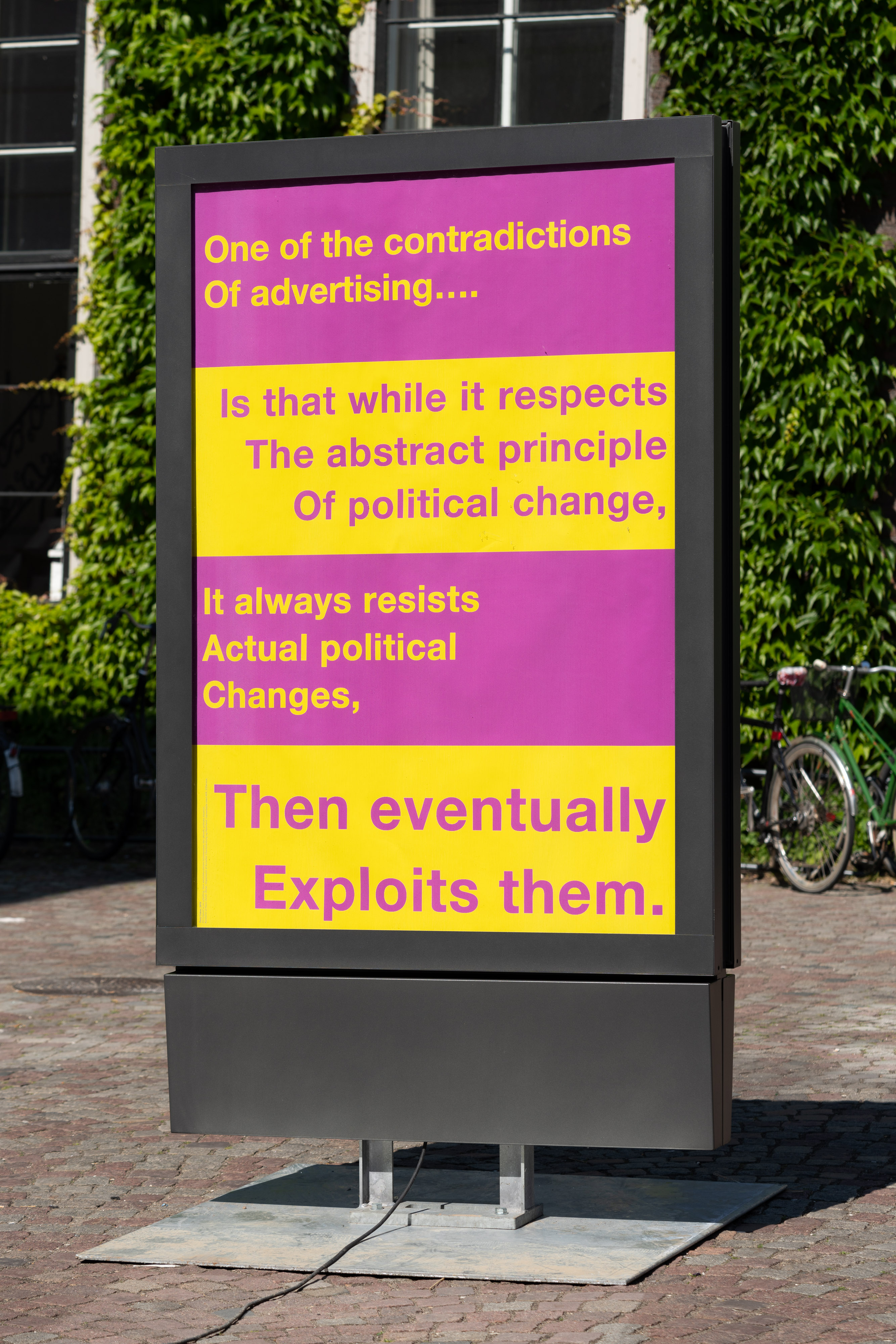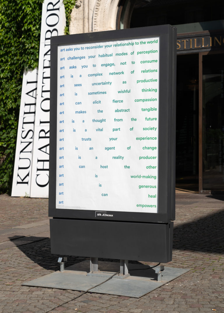 Etel Adnan (Libanon/USA), Sophia Al-Maria (Qatar/USA), Tania Bruguera (Cuba), Tony Cokes (USA), Olafur Eliasson (Danmark), Hans Haacke (Tyskland), Lauren Halsey (USA), Eileen Myles (USA), Precious Okoyomon (England), Wolfgang Tillmans (Tyskland), Rirkrit Tiravanija (Argentina/Thailand) & Nora Turato (Kroatien).