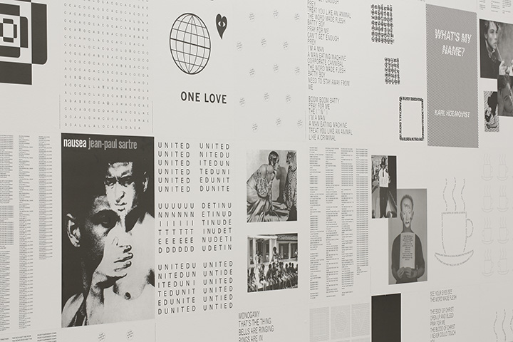 En gigantisk ophængning af 71 forskellige sort/hvide plakater er omdrejningspunktet for Holmqvists udstilling, der udspiller sig i Sydfløjens store centrale sal. Plakaterne er klæbet op på væggene, fra gulv til loft, som et flimrende sort og hvidt tapet af ord og billeder. Udstillingen viser også 3 videoværker: I’M WITH YOU IN ROCKLAND (2005), I’LL MAKE THE WORLD EXPLODE (2008) og A IS FOR A-R-A-K-A-W-A (2012).