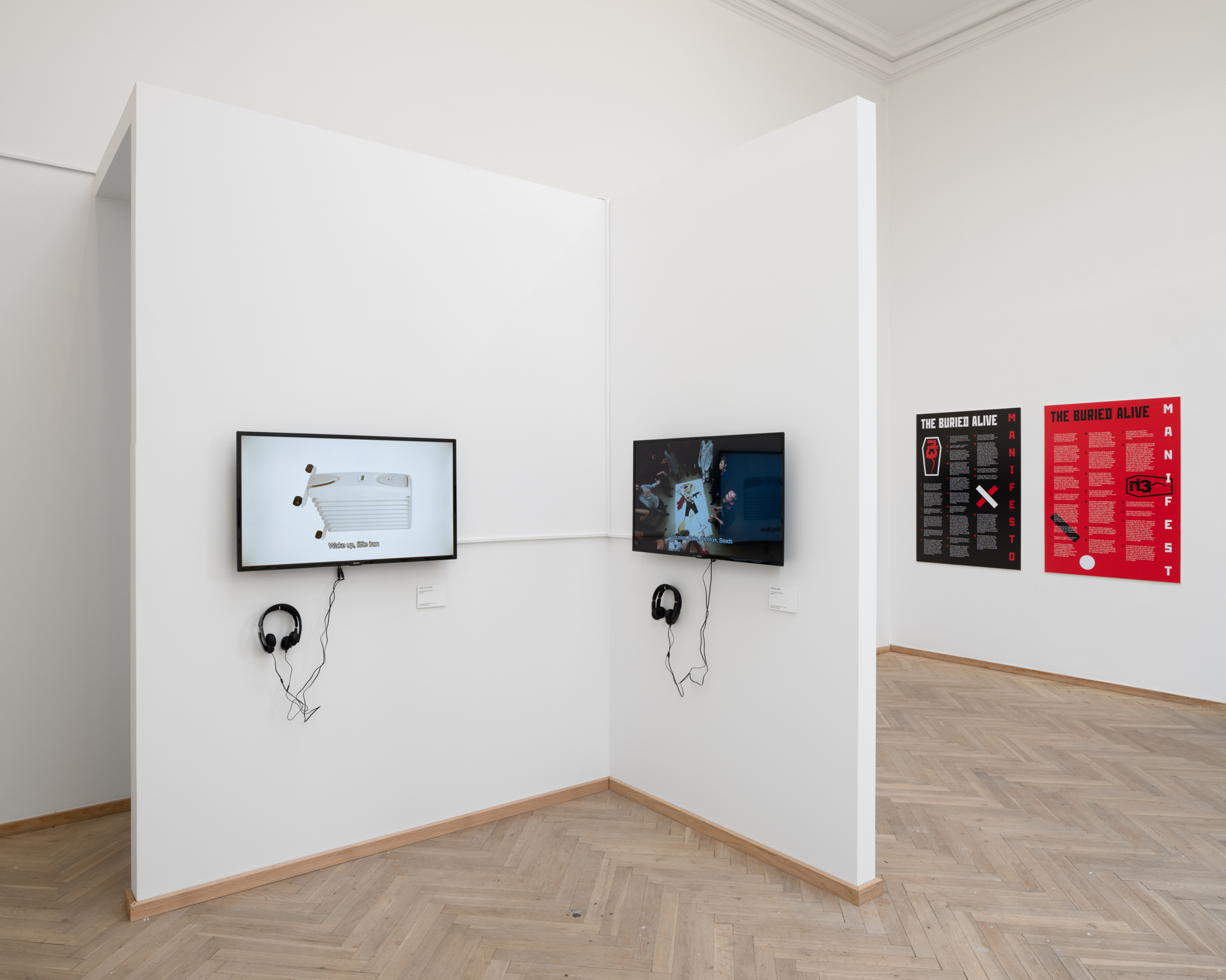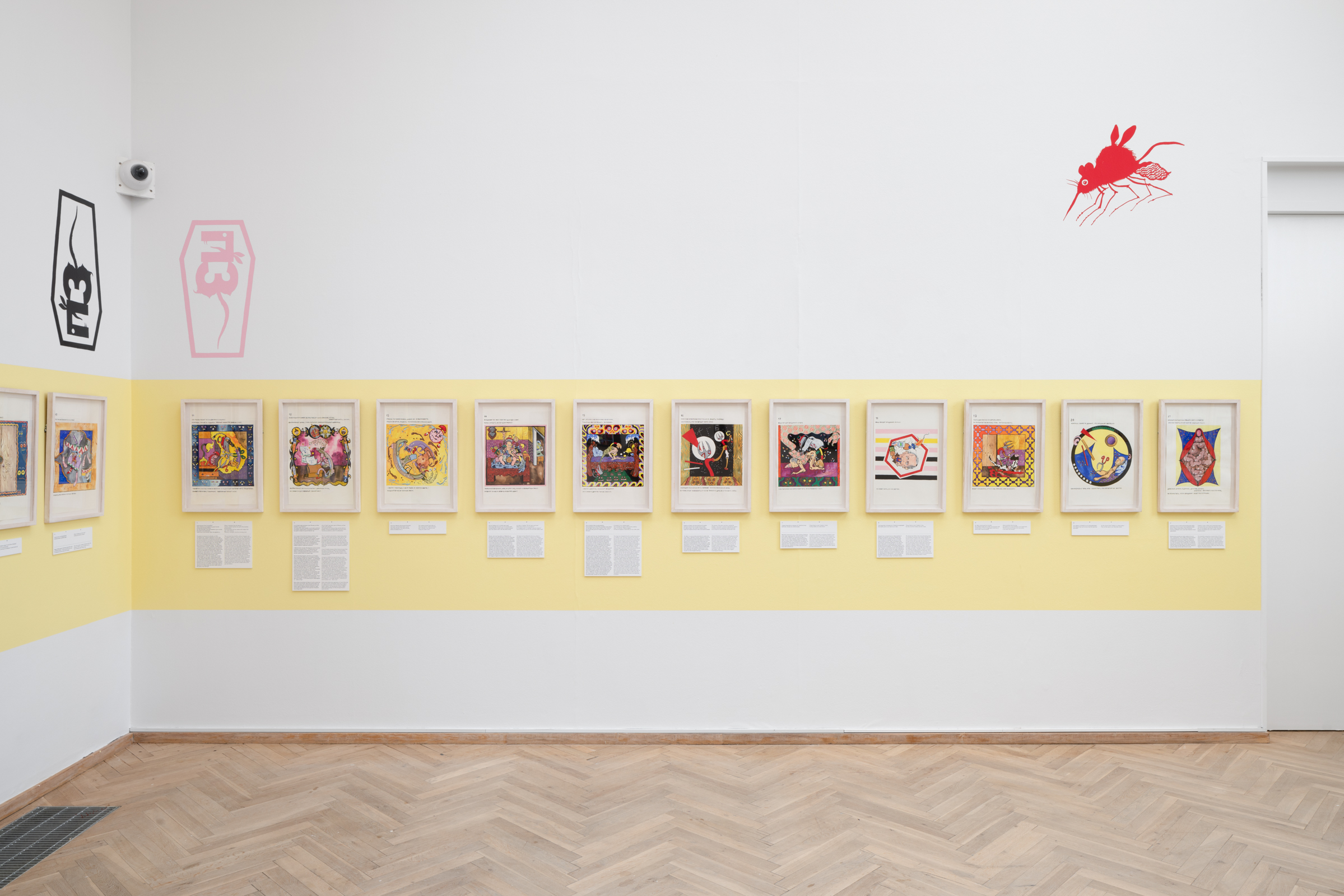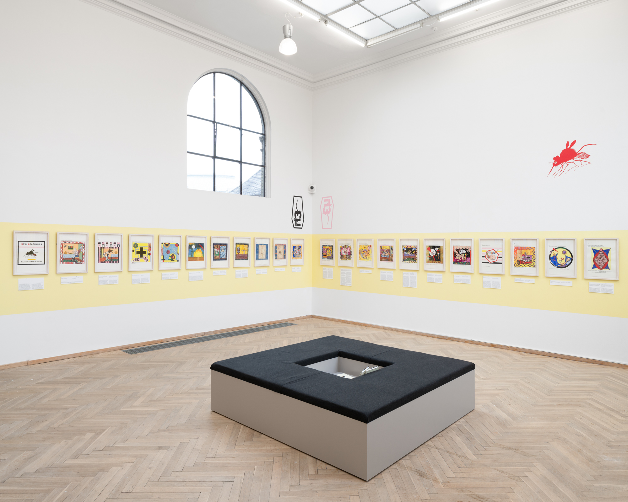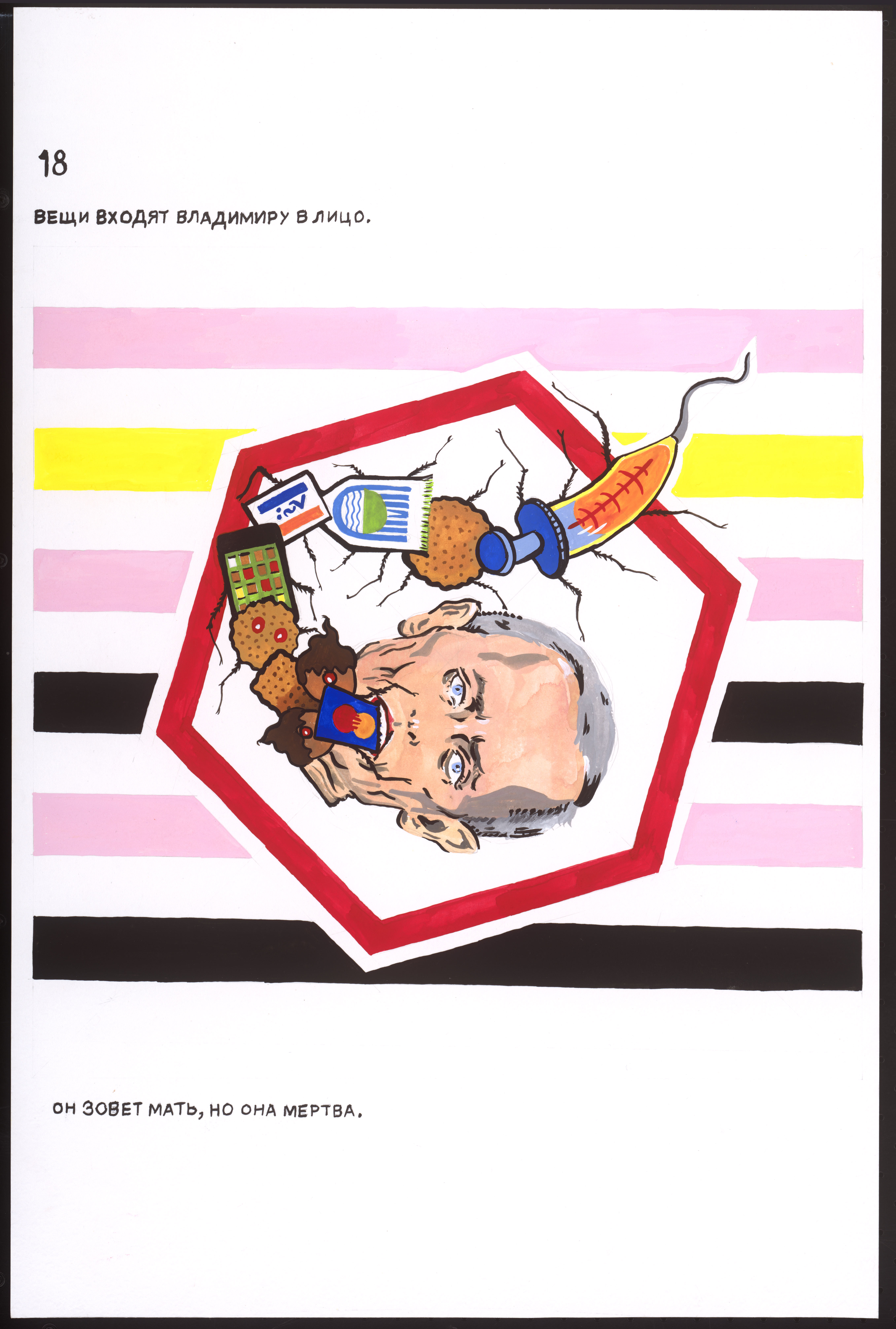 Vladimir’s Night er en hybrid af en børnebog, en martyrhistorie og en twisted politisk fortælling, hvor hovedpersonen Vladimir både er et lille barn og en politisk leder. Han er omgivet af animerede genstande og absurde scenarier. Det hele starter som en munter billedfabel, der langsomt glider over i voldsom og grotesk fortælling om magt og tortur. Vladimir’s Night er sandsynligvis skrevet af Maxim Komar-Myshkin, som er et pseudonym for den russiske poet Efim Poplavsky (1978-2011), der immigrerede til Tel Aviv i starten af 2000erne. Hans fiktioner inkluderede med stor sandsynlighed også grundlæggelsen af kunstnerkollektivet Buried Alive Group, hvis videoer og manifester også kan opleves i udstillingen.