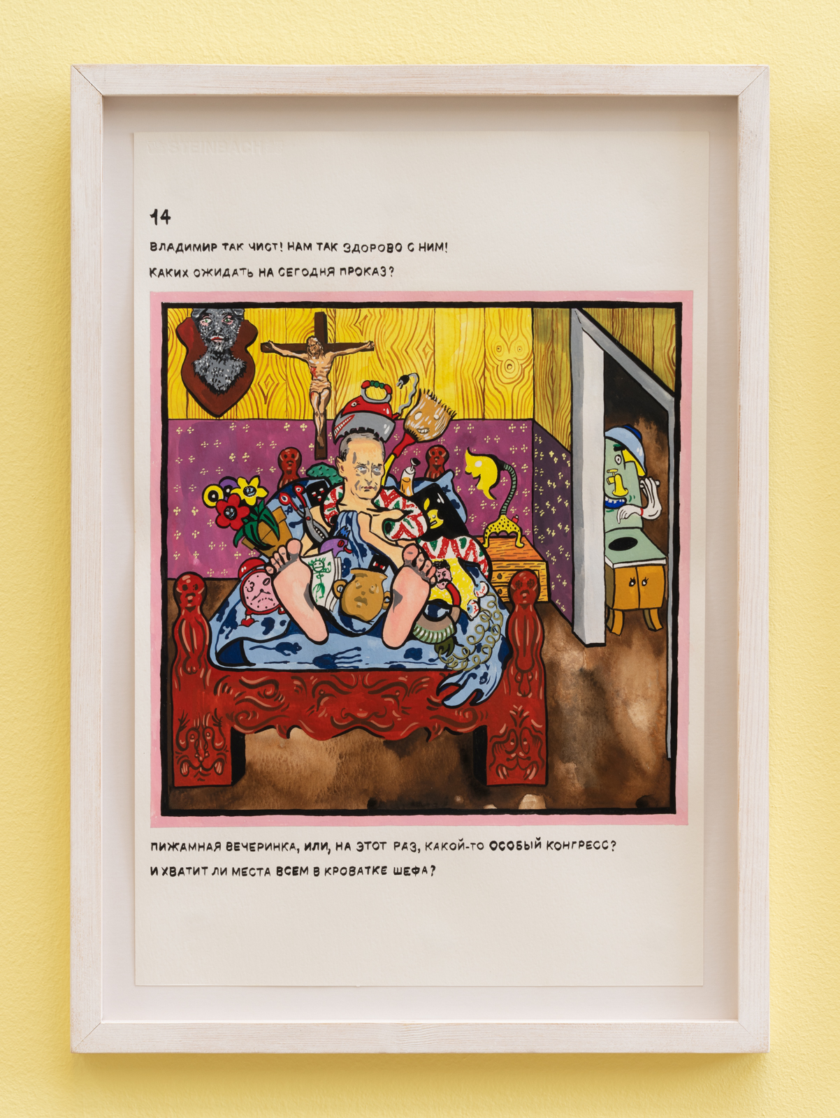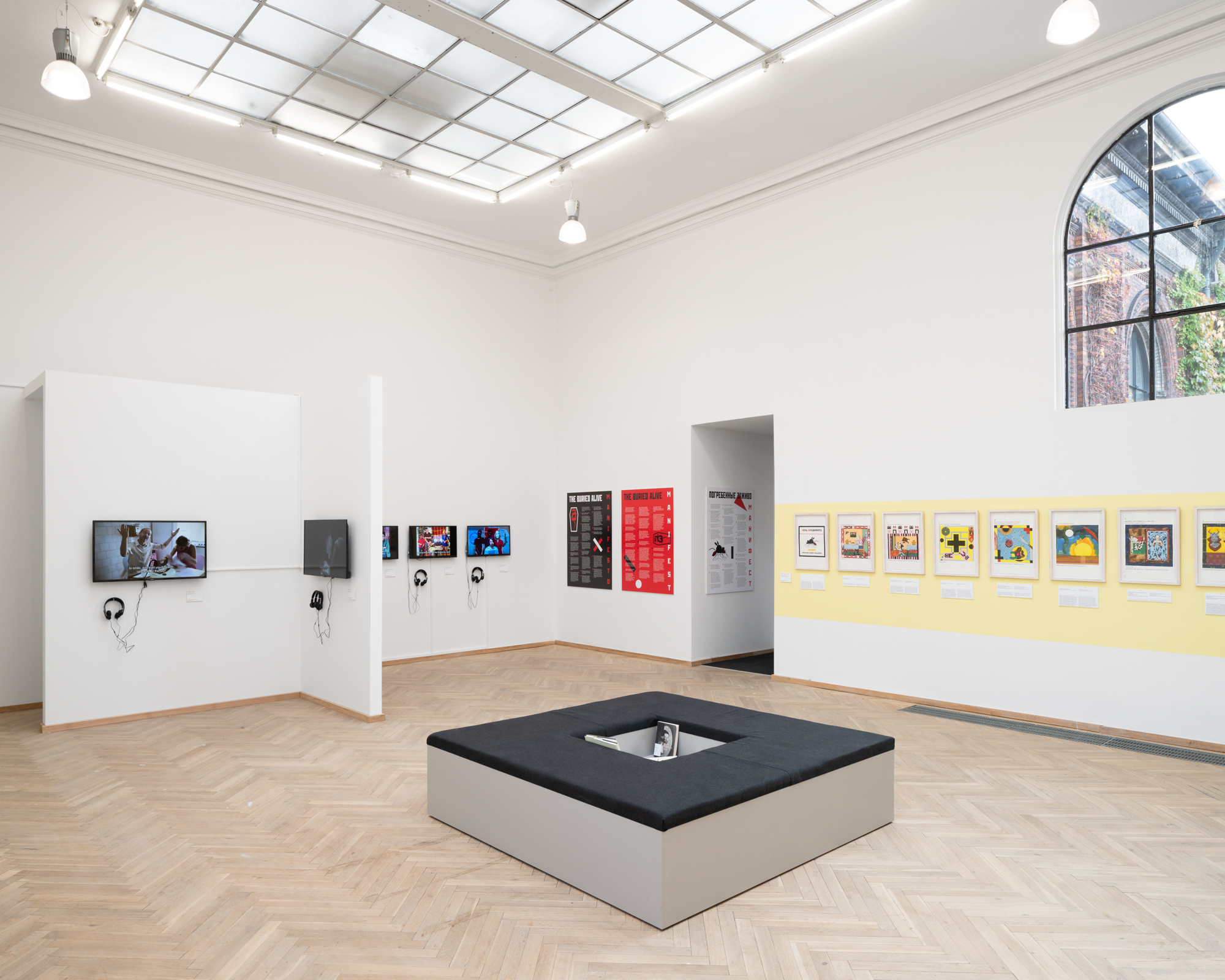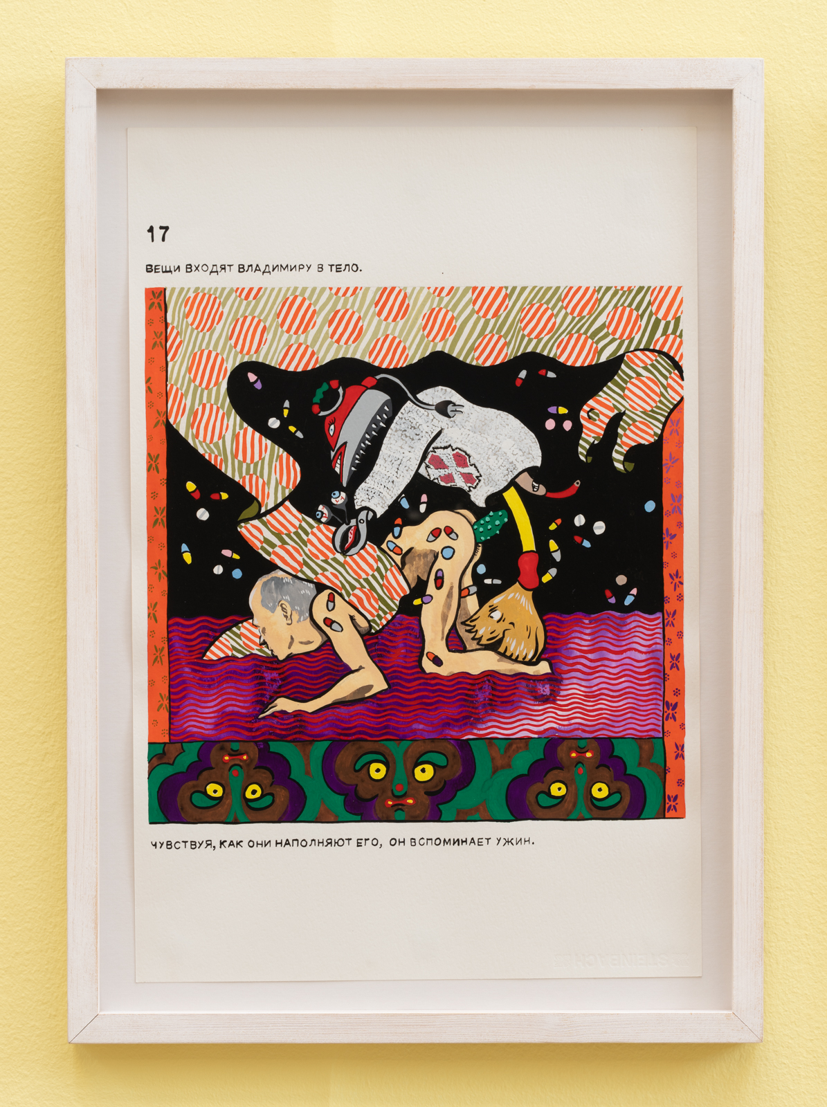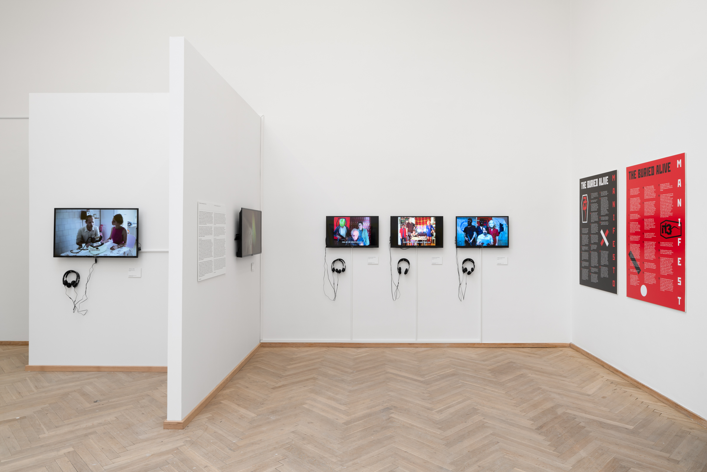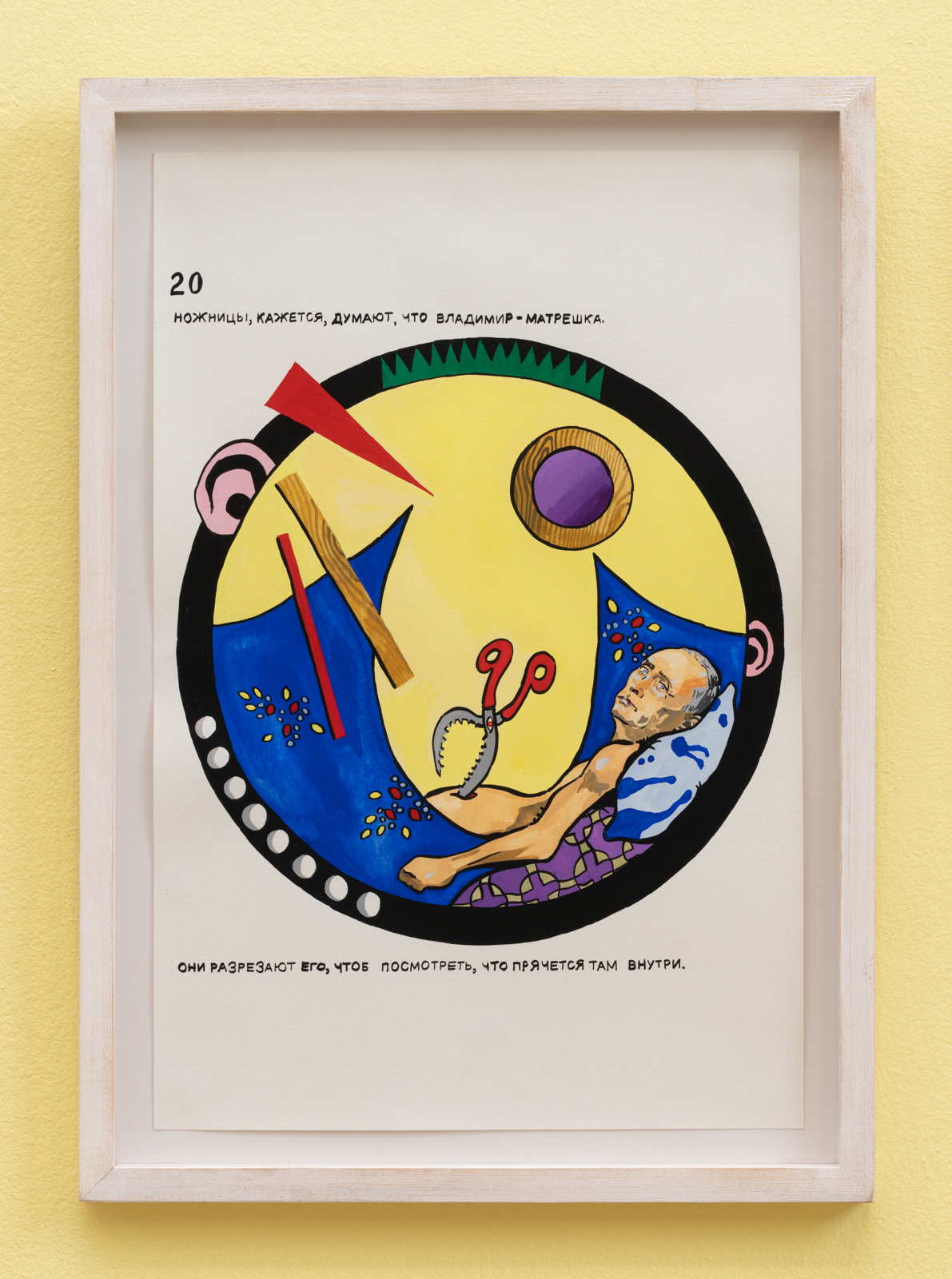 Vladimir’s Night er en hybrid af en børnebog, en martyrhistorie og en twisted politisk fortælling, hvor hovedpersonen Vladimir både er et lille barn og en politisk leder. Han er omgivet af animerede genstande og absurde scenarier. Det hele starter som en munter billedfabel, der langsomt glider over i voldsom og grotesk fortælling om magt og tortur. Vladimir’s Night er sandsynligvis skrevet af Maxim Komar-Myshkin, som er et pseudonym for den russiske poet Efim Poplavsky (1978-2011), der immigrerede til Tel Aviv i starten af 2000erne. Hans fiktioner inkluderede med stor sandsynlighed også grundlæggelsen af kunstnerkollektivet Buried Alive Group, hvis videoer og manifester også kan opleves i udstillingen.