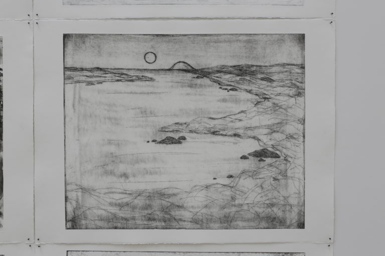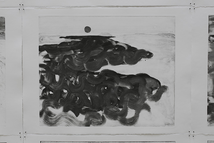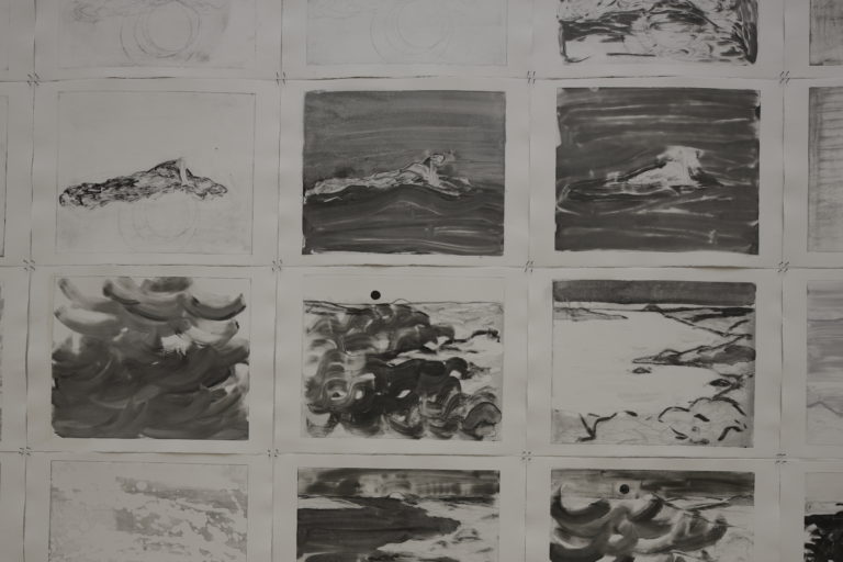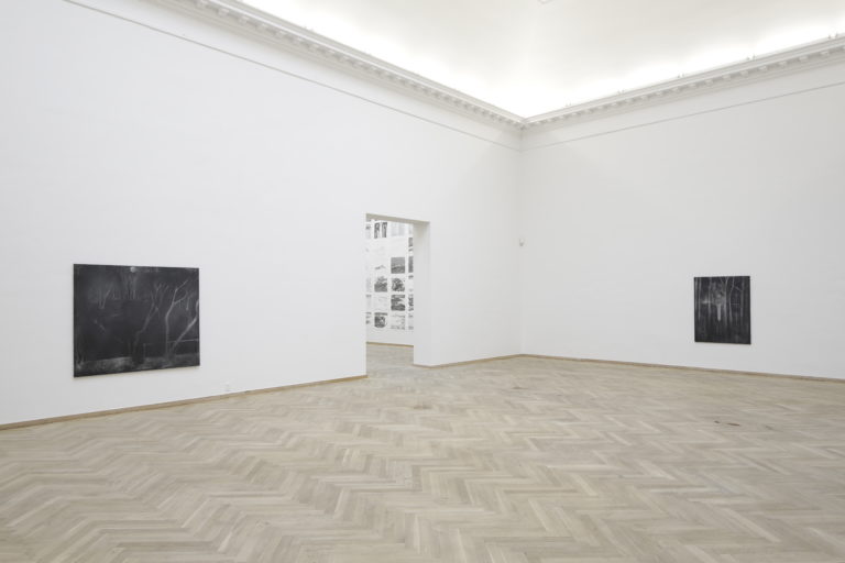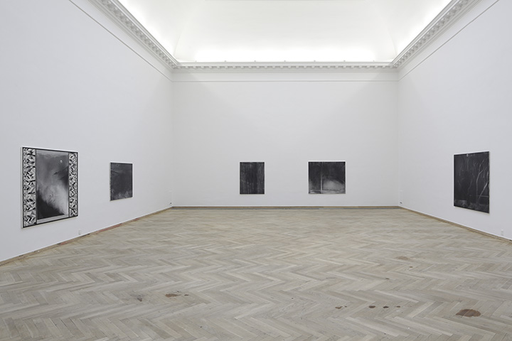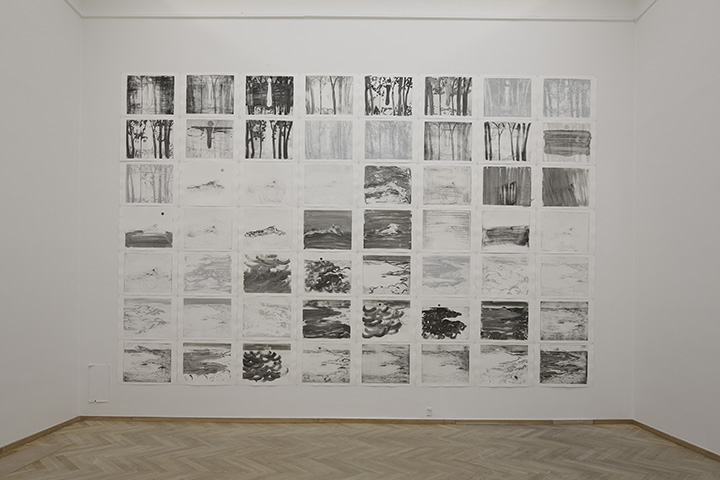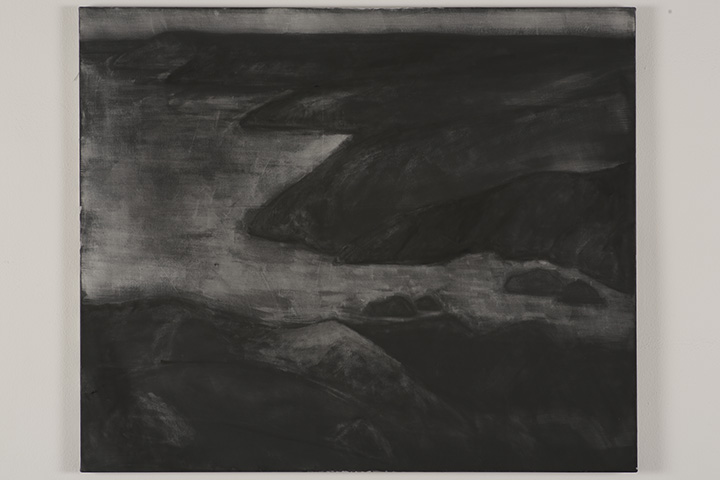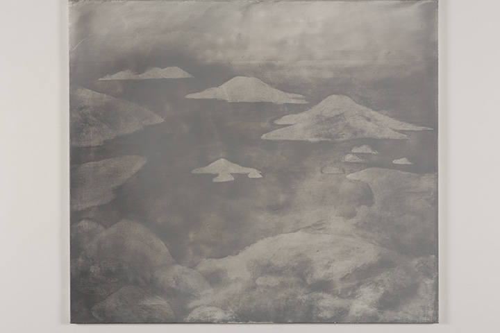 Silke Otto-Knapp arbejder med akvarel på lærred i et næsten monokromt spektrum. Et materialevalg, der giver mulighed for at opbygge de komplekse, halvtransparente, lag-på-lag flader, der præger hendes landskaber.