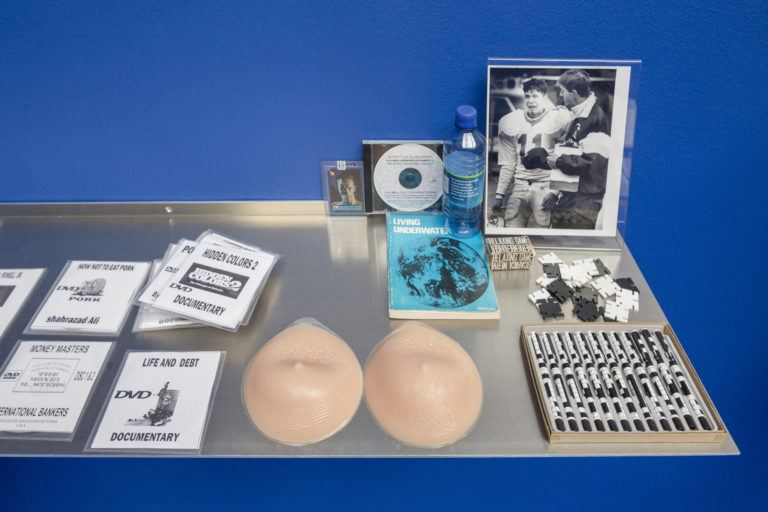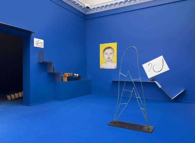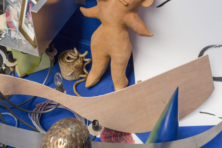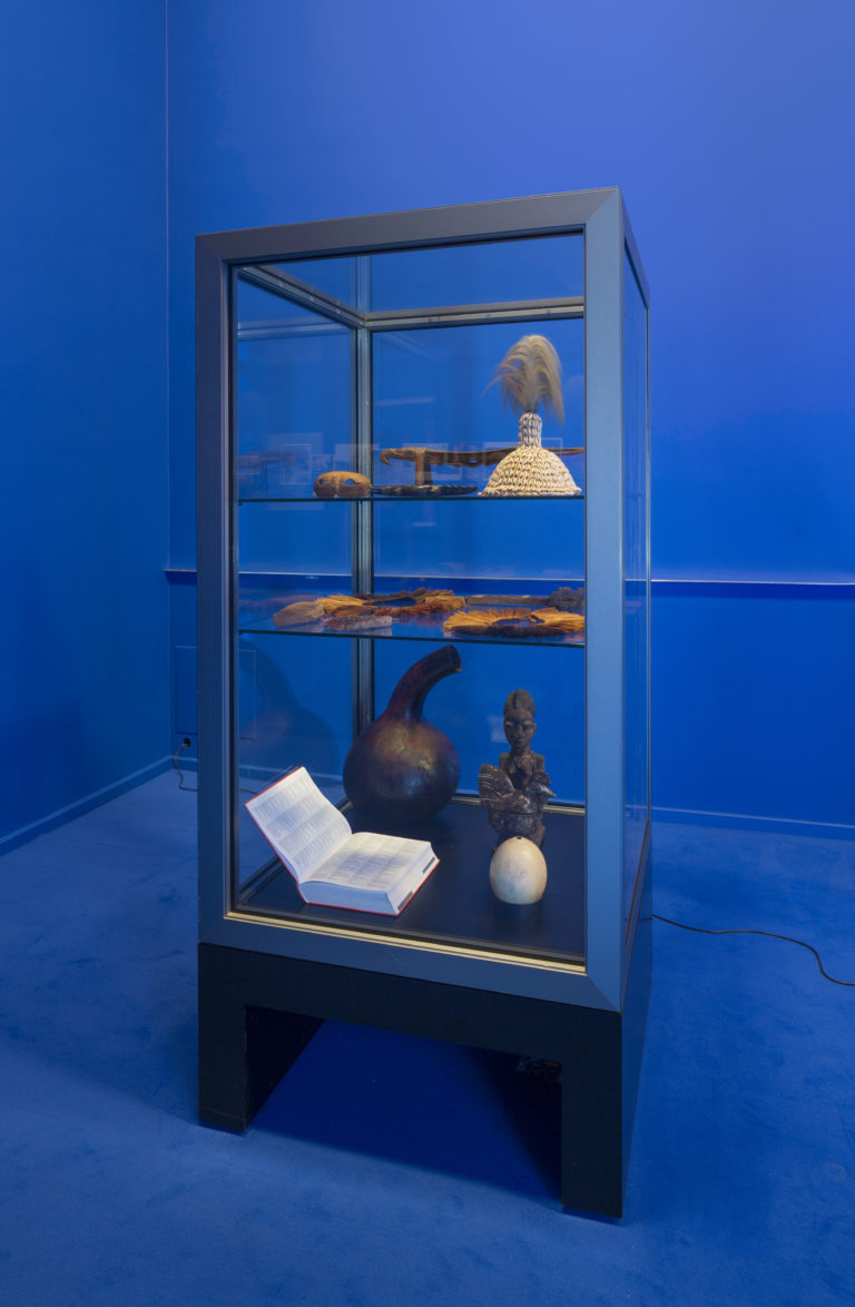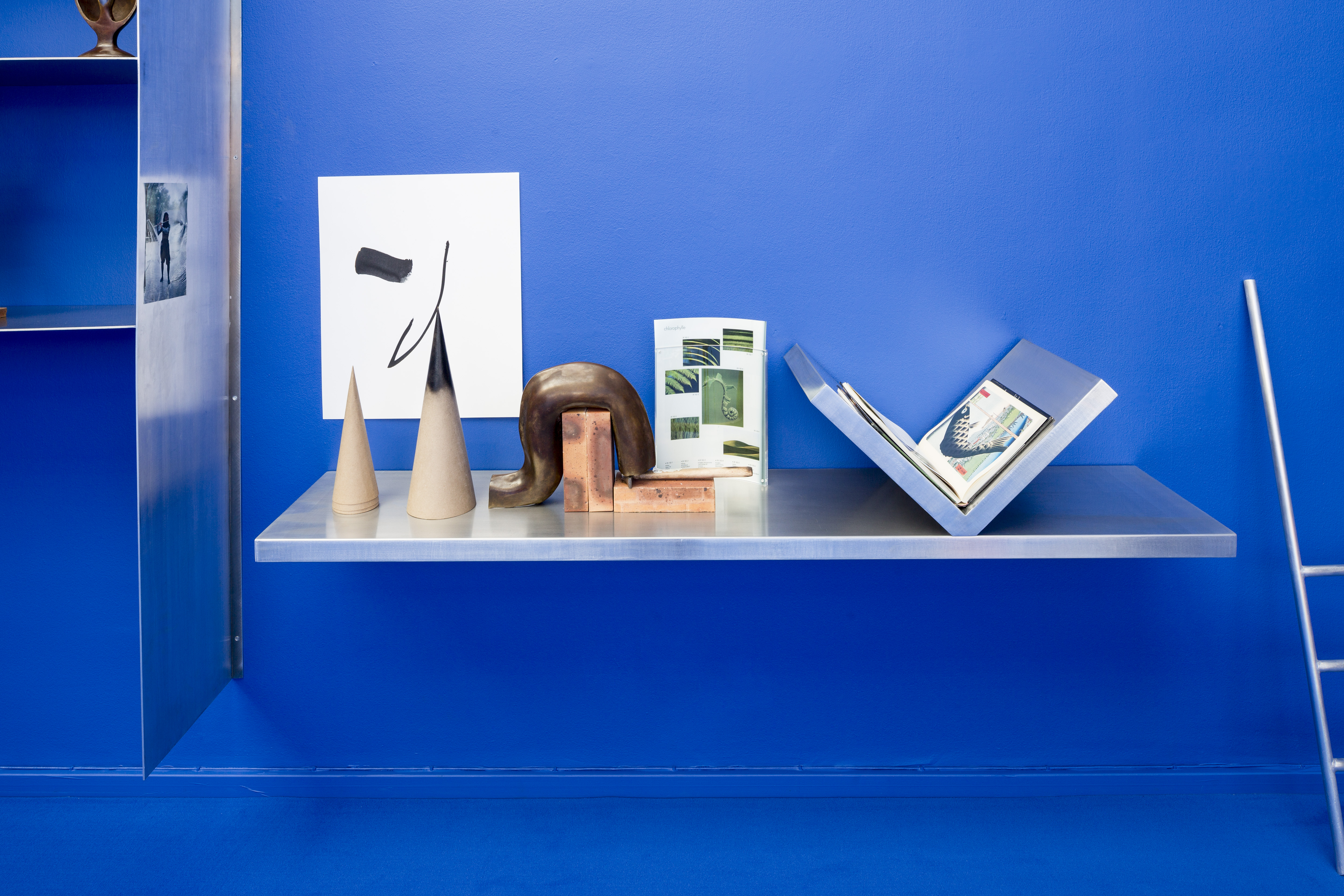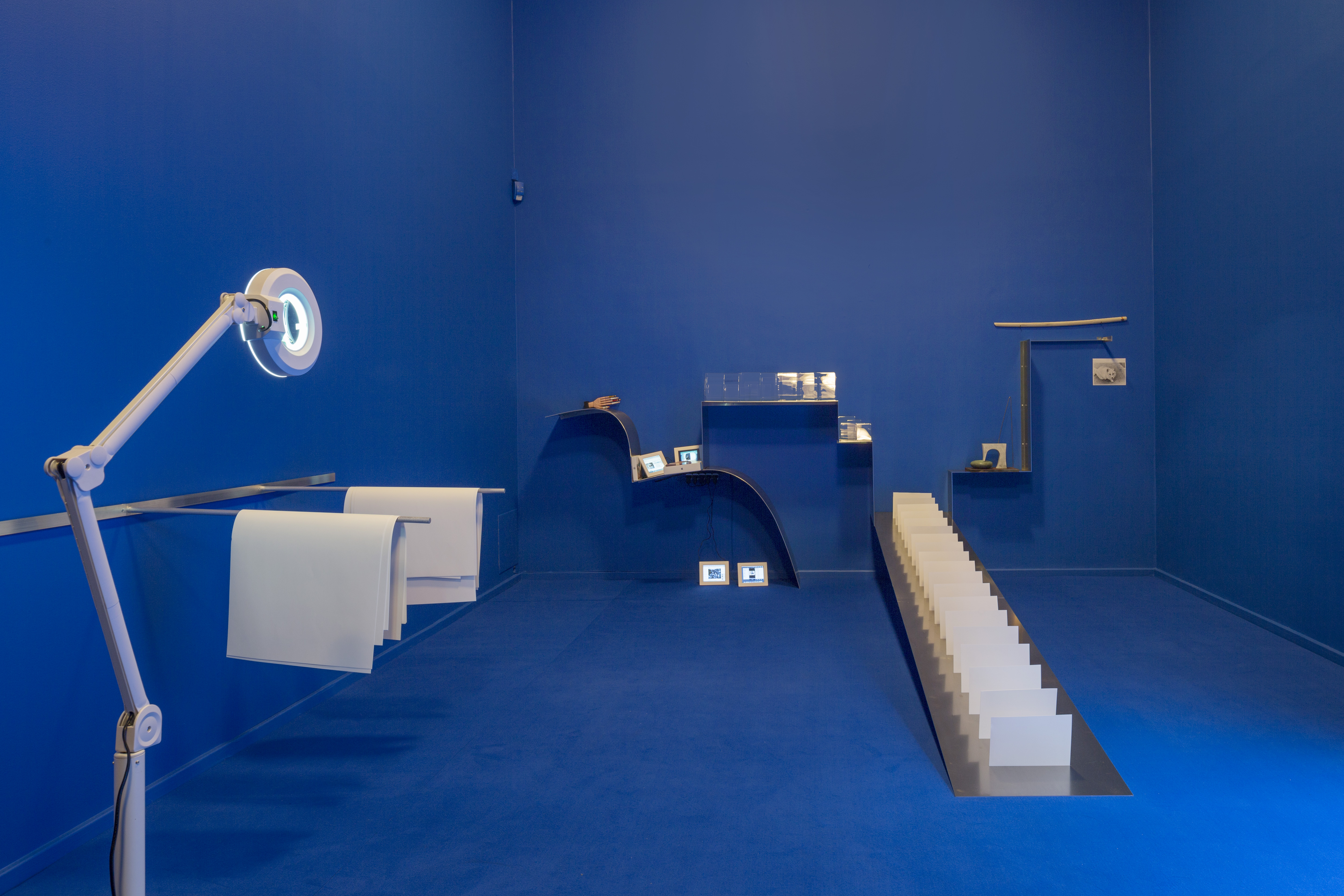 The Pale Fox articulates our desire to make sense of the world through the objects that surround us. Unfolding like a frieze across the four walls of the gallery, a polymorphous aluminium shelf provides a structure wherein the four points of the compass are aligned with stages in an individual lifecycle, the evolution of technology, philosophical principles of Leibniz and the four Classical elements. This highly personalised aggregation of distinct systems of thought is presented through an intense accumulation of objects and images encountered within a highly constructed, meditative environment.