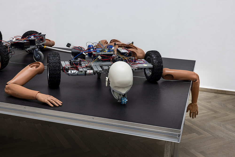 There is an intimate erotic link between human and technology in Geumhyung Jeong’s artworks, where the artist assembles robot parts, medical torsos, wires, transformers and other electronic components into human-like robots – dead technological Toys. Creatures that can only be activated through controllers and power supply. Our intimate relationship with technology, the tension between desire and control and our intimate interaction with non-living things are at the heart of Jeong’s works. Jeong, who is trained in theater and dance, choreographs her artworks as a kind of low-tech mechanical ballet with her own body and self-built robots as partners. At Kunsthal Charlottenborg the artist has created an installation of the sub-elements she builds the non-living bodies from – they are bathed in dead light on stage tables in the room. In the videos in the back we see the artist’s work of bringing the parts together into half-finished beings that can move on the verge of being brought to life. There is a continuing controlled tension between the artist’s fetish- like robot production and the small games of activity that emerge in the machines. The interactions between human and machine are limited and come in short electrical pulsations.