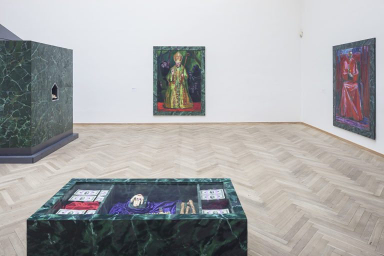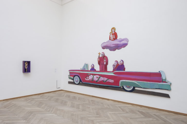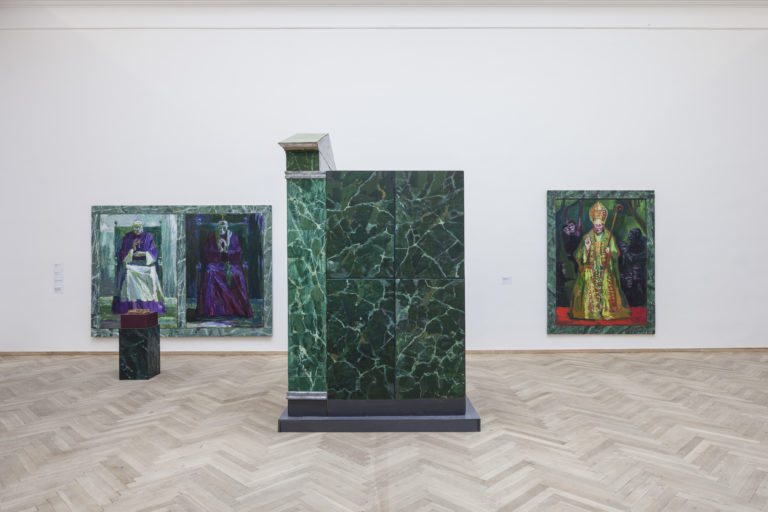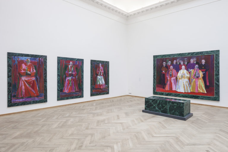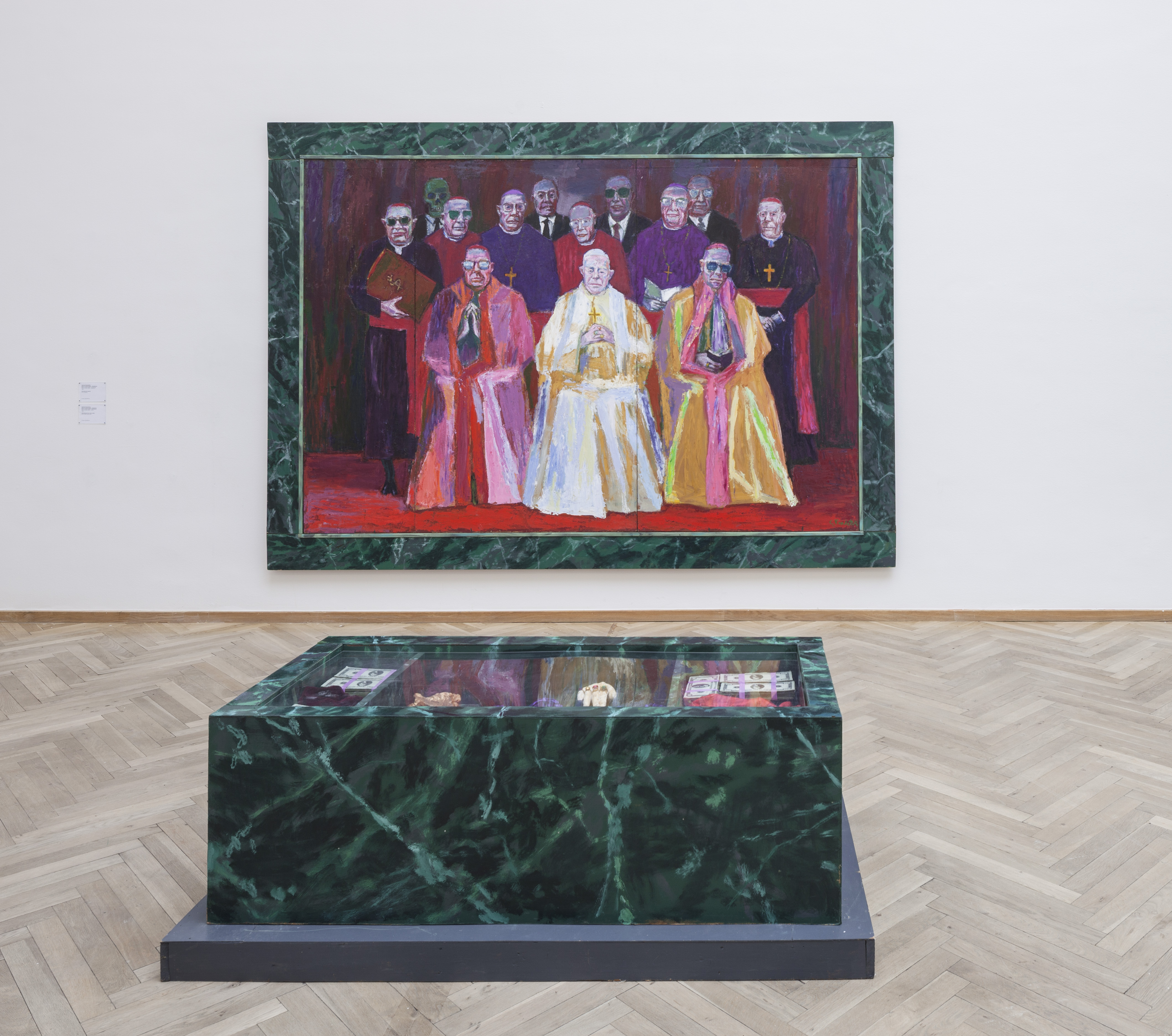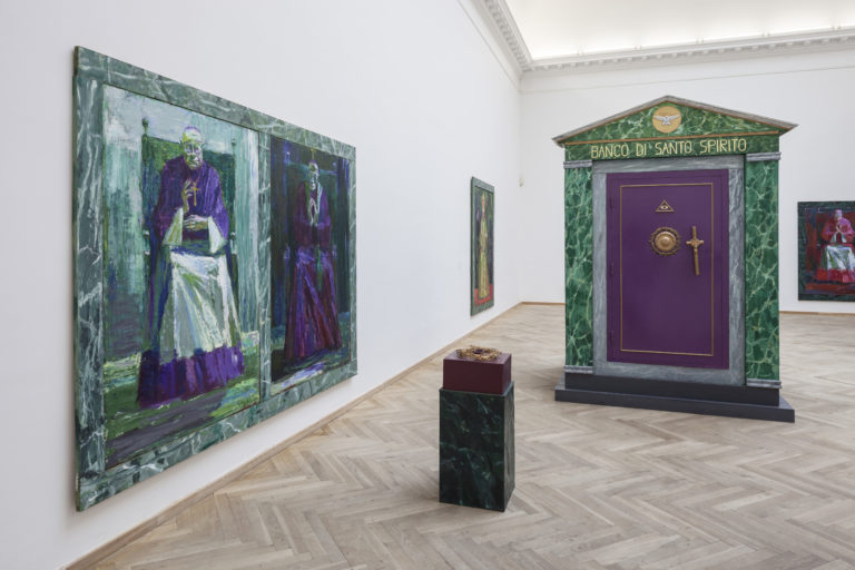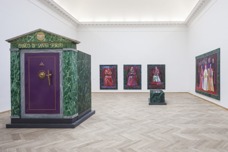 The series of antimilitarist wall charts mix politics with satire in an almost cartoon-like painterly style, pointing to the absurdity of the means and ends of warfare with their combinations of images and texts. In a similar move, the painted portraits of religious figures from the installation Banco di Santo Spirito represent marked contrasts to the glorifying papal portraits typical of art history.