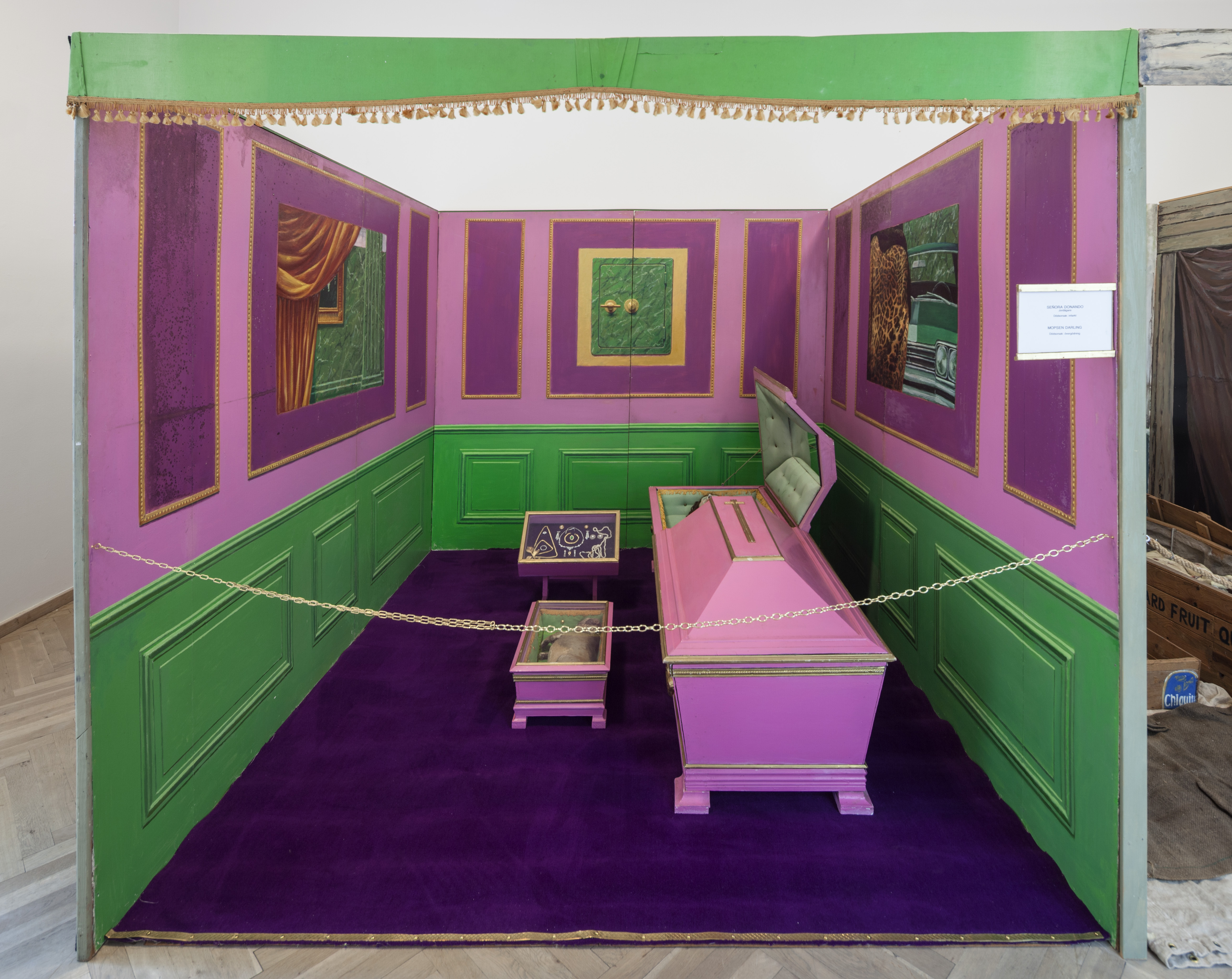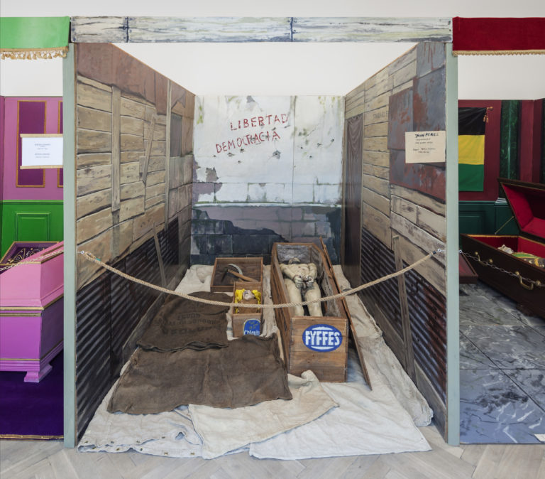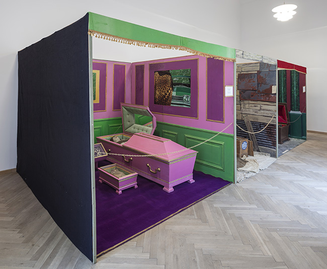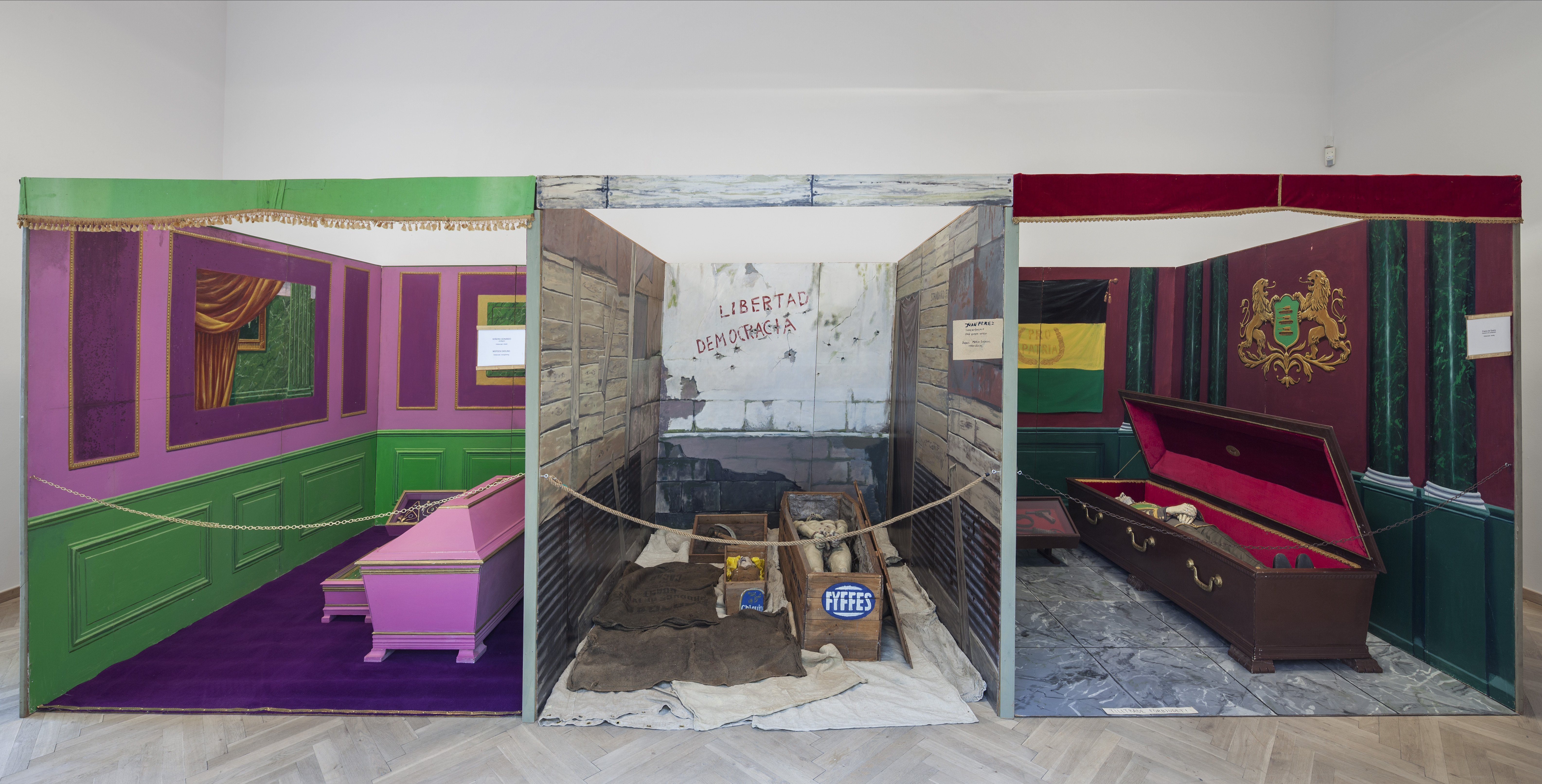 The series of antimilitarist wall charts mix politics with satire in an almost cartoon-like painterly style, pointing to the absurdity of the means and ends of warfare with their combinations of images and texts. In a similar move, the painted portraits of religious figures from the installation Banco di Santo Spirito represent marked contrasts to the glorifying papal portraits typical of art history.
