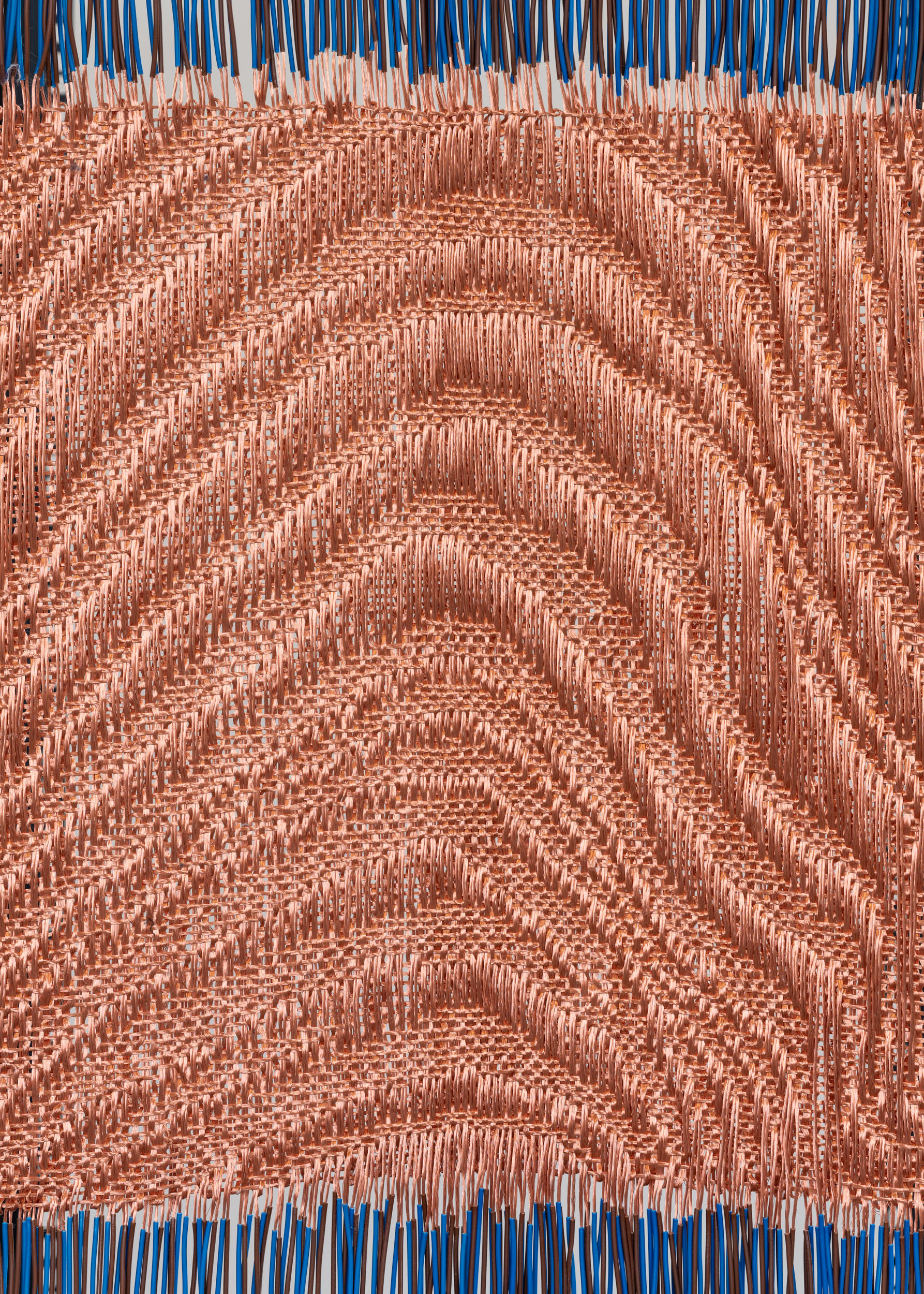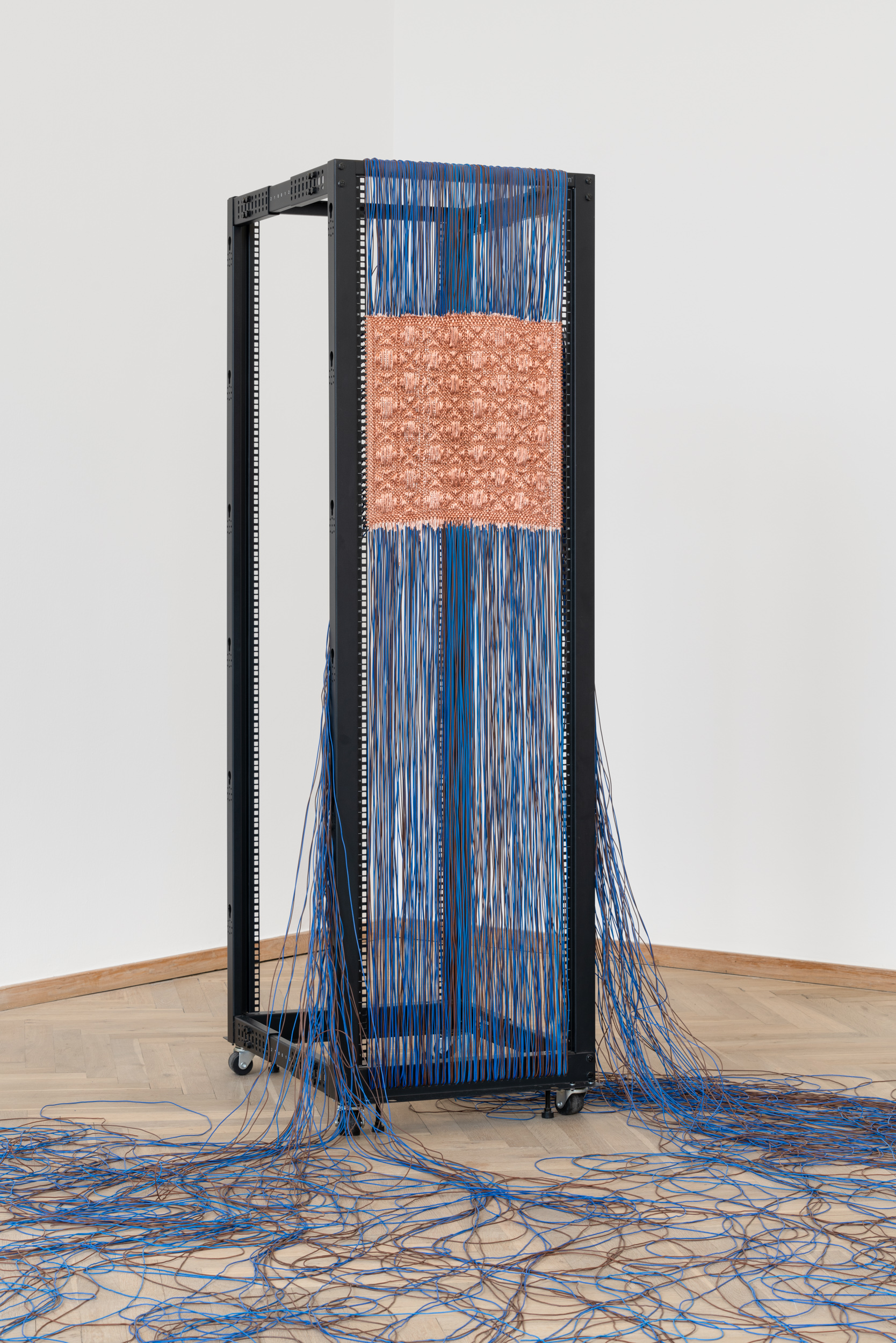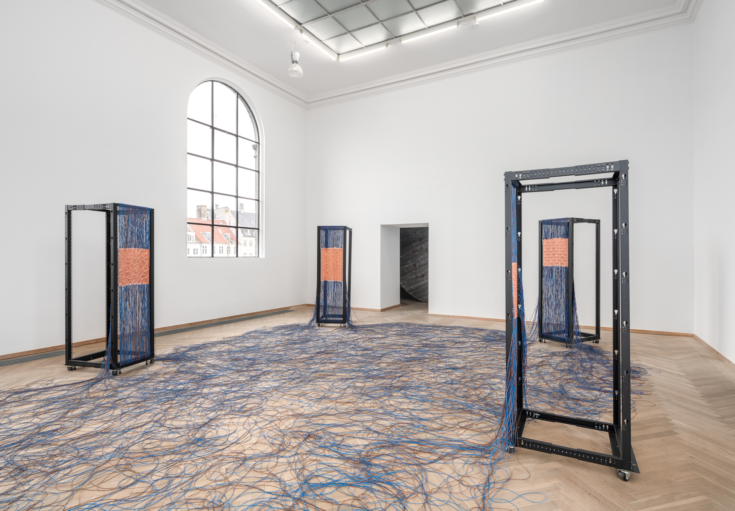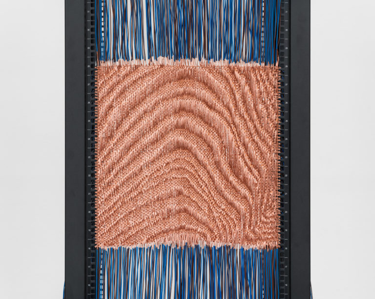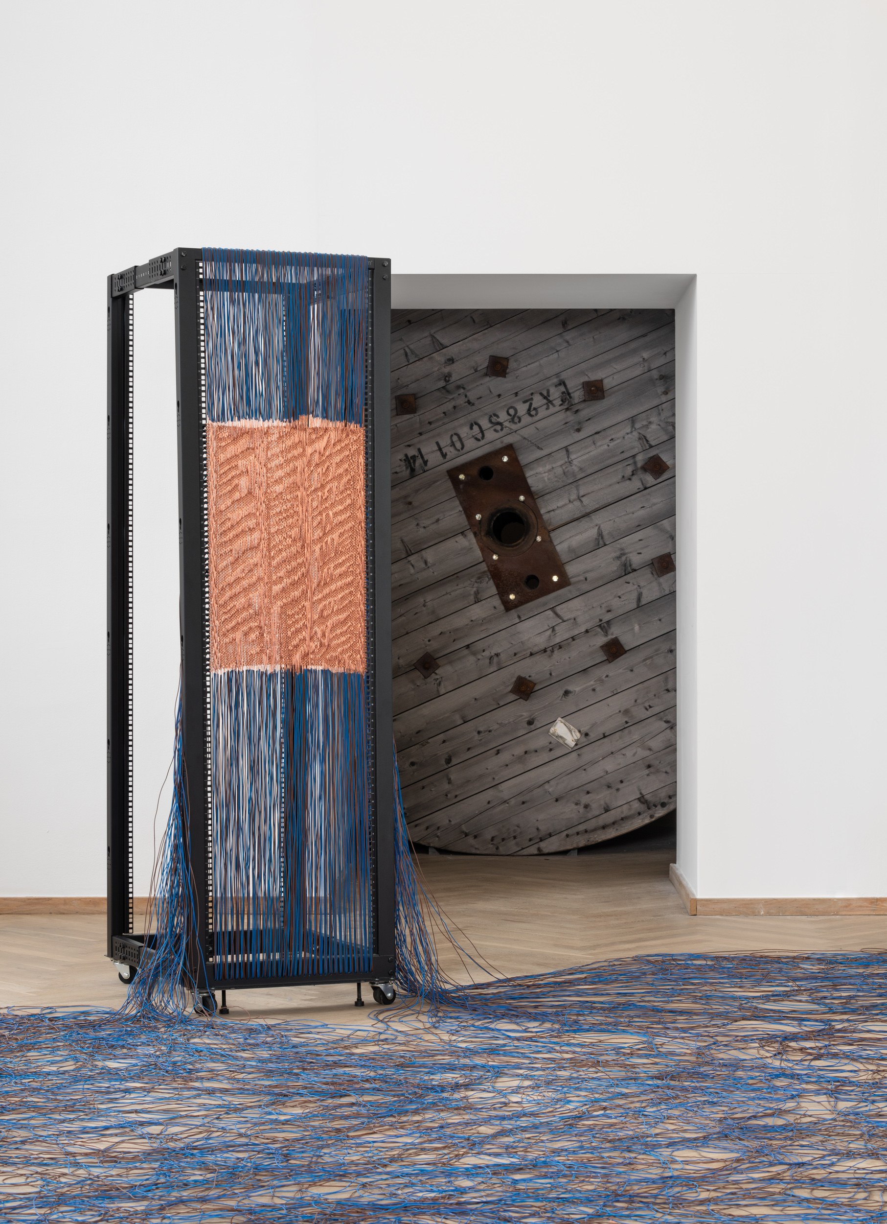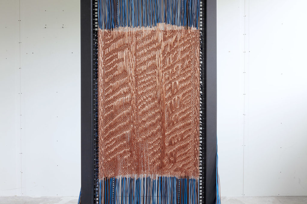 Cable drums, microchip waste, wires and server racks are among the materials used in Digital Matters, which consists of a series of sculptural installations done as ceramic mosaics made out of waste products from a microchip factory and as woven algorithms made of optical fibre cables and copper wire.