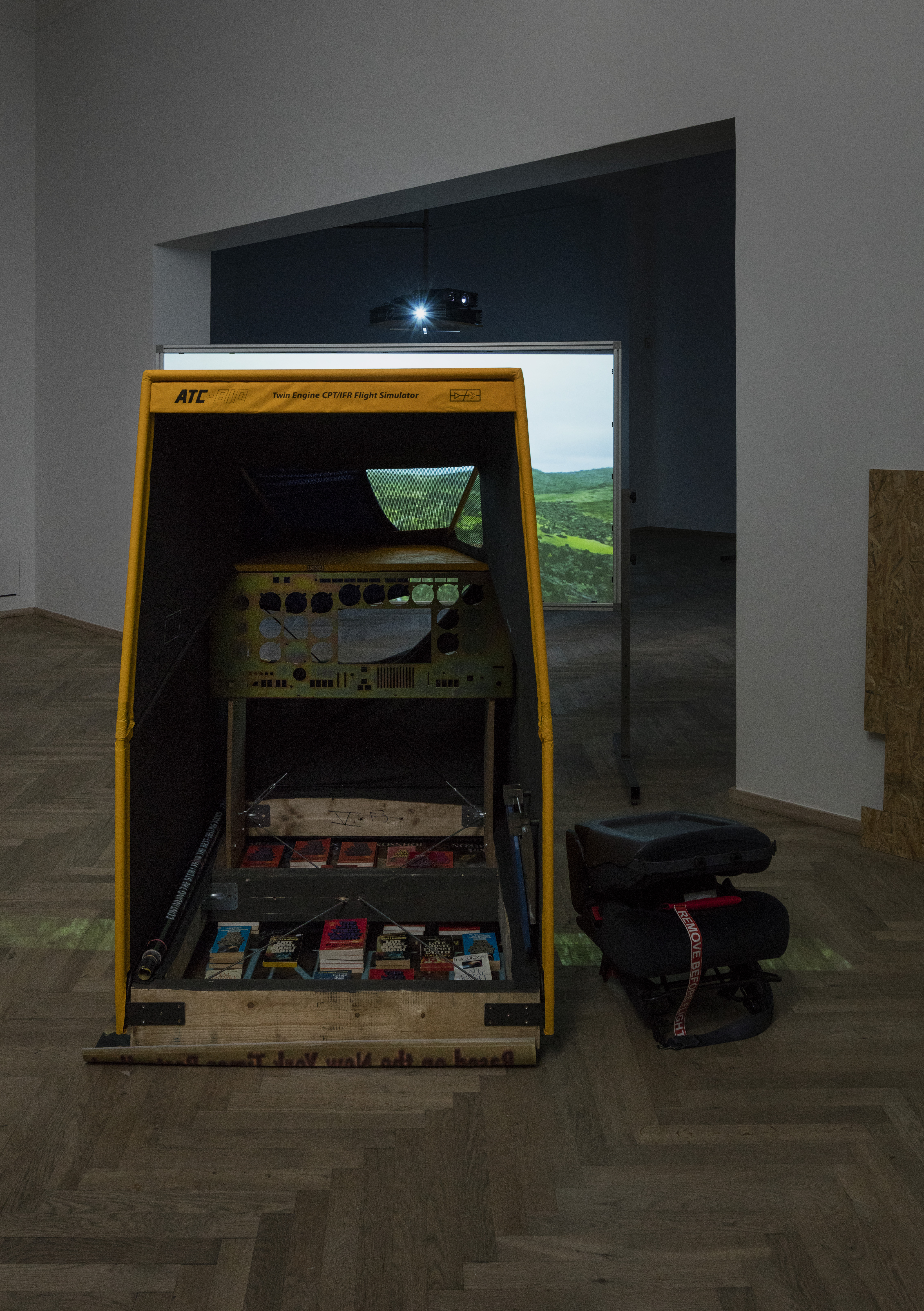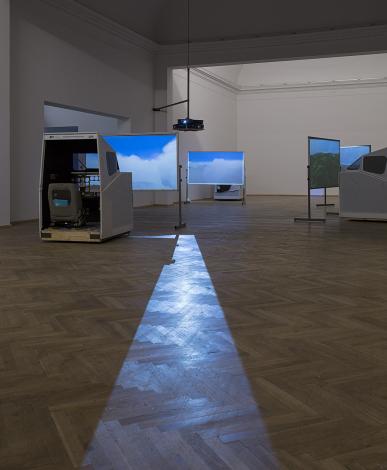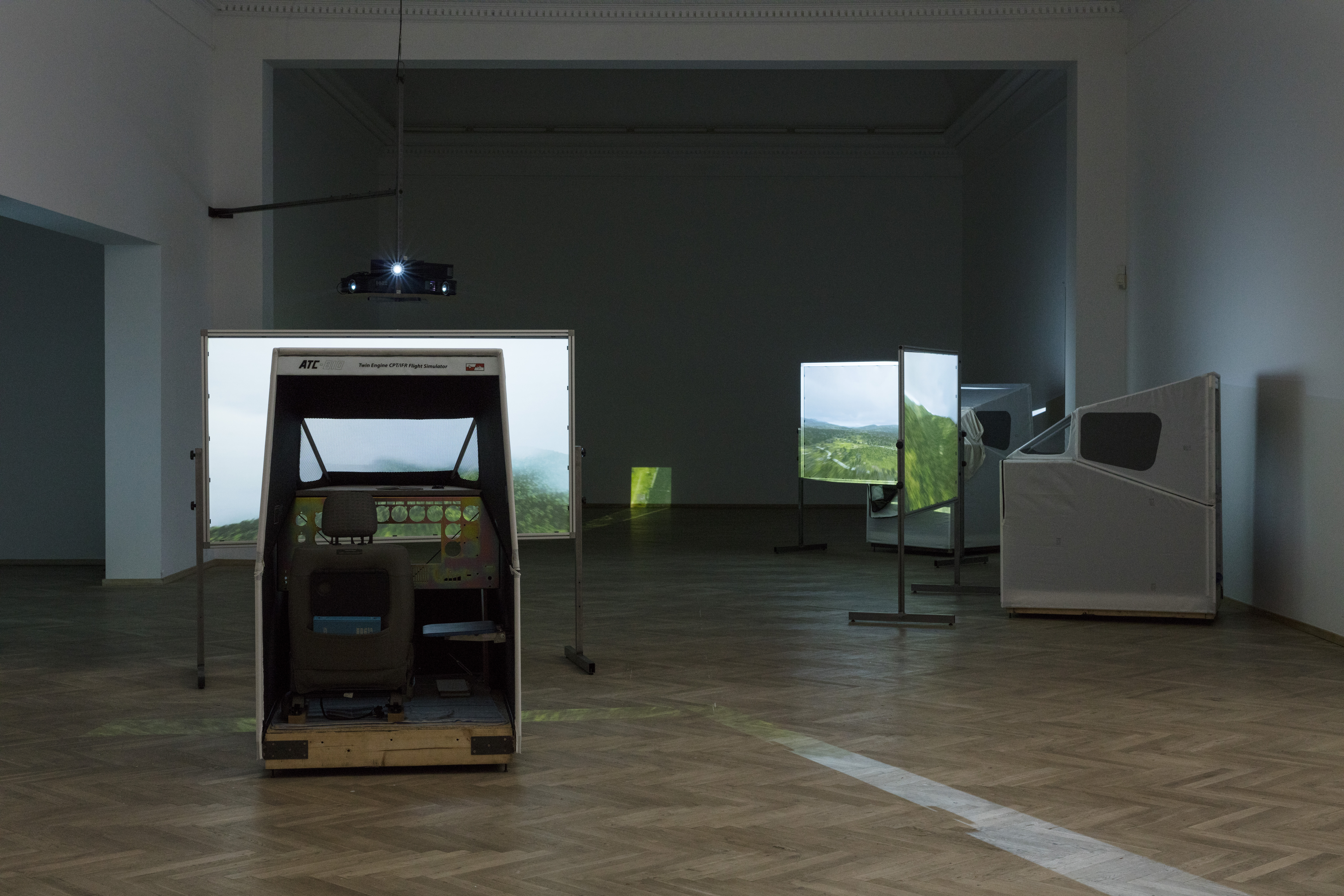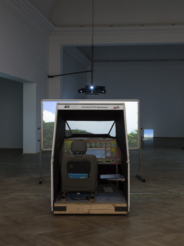 Six home-built flight simulators placed in a circle take exhibition visitors on a network of silent, imaginary plane rides using a physically constructed cockpit and a virtually constructed terrain in the form of computer software. The flights take us to remote areas in the highlands of Papua New Guinea, where small planes play a vital role in navigating the difficult terrain. Thus, the aeroplane holds particular significance for the local population as well as Christian missionaries in the region.