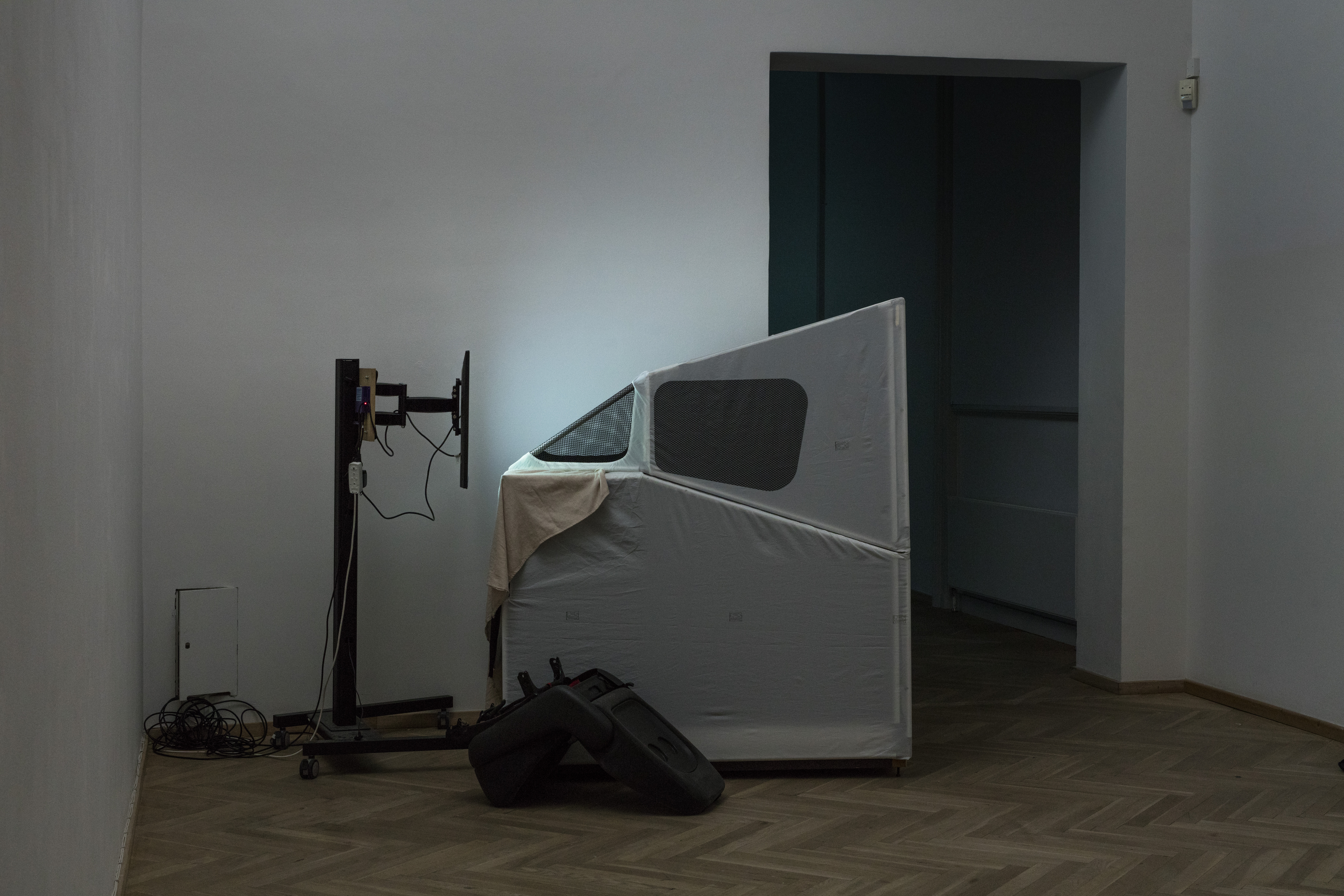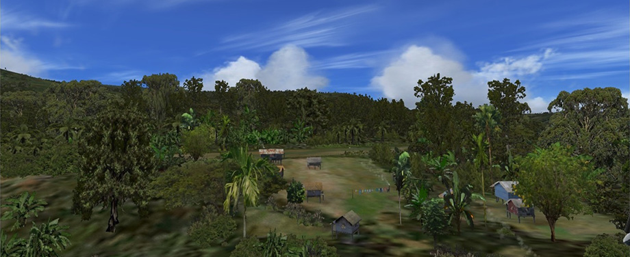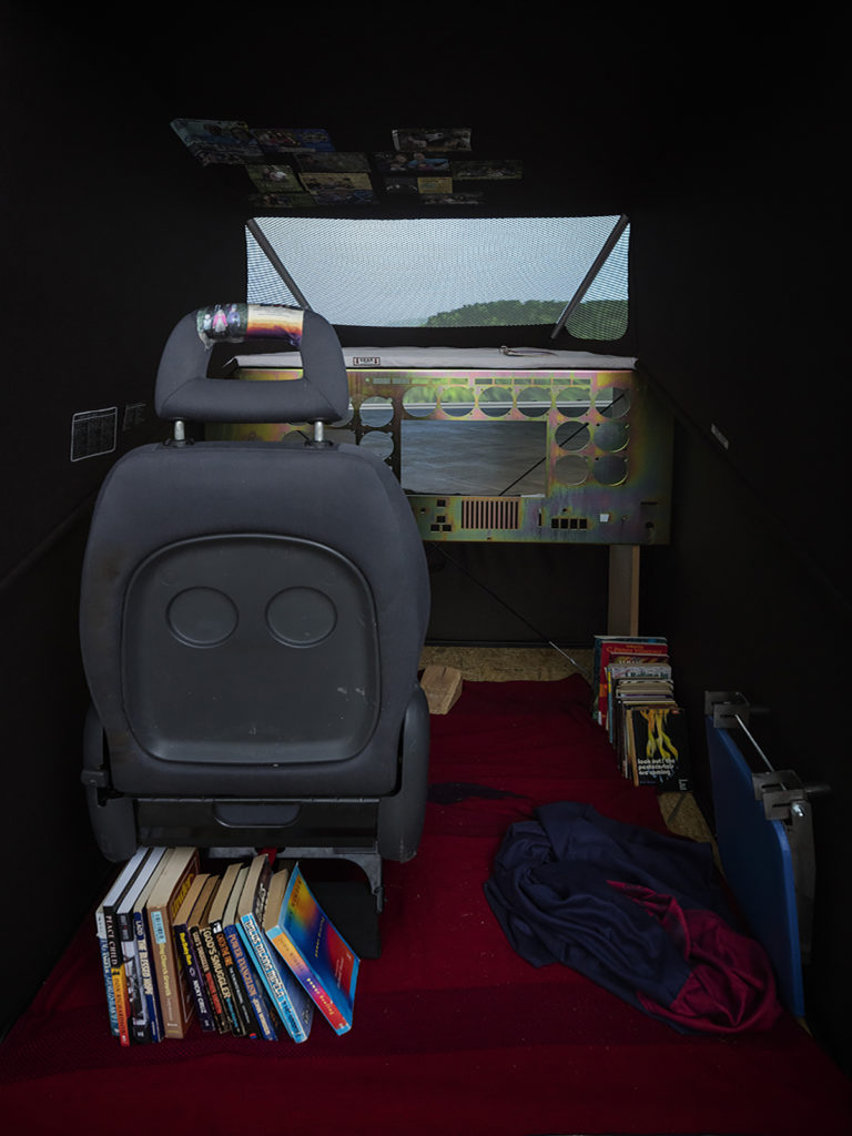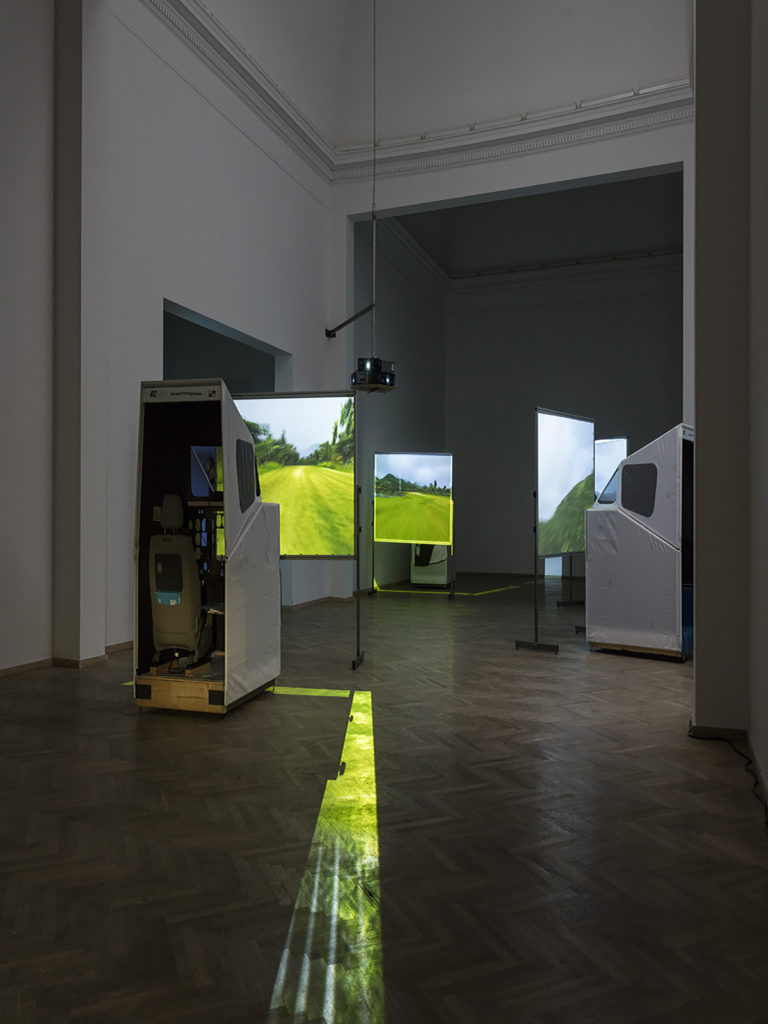 Six home-built flight simulators placed in a circle take exhibition visitors on a network of silent, imaginary plane rides using a physically constructed cockpit and a virtually constructed terrain in the form of computer software. The flights take us to remote areas in the highlands of Papua New Guinea, where small planes play a vital role in navigating the difficult terrain. Thus, the aeroplane holds particular significance for the local population as well as Christian missionaries in the region.